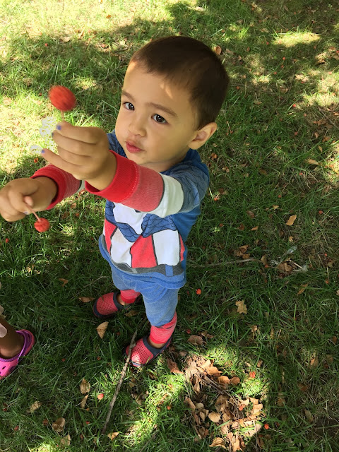 He got super jealous of Jade's ligh-up shoes, and we got him some Spiderman ones. (He's really cute when he gets jealous.)